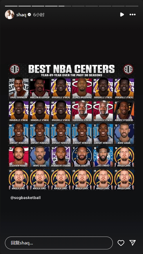 2025-03-13 00:38:00奥尼尔晒过去30年最佳中锋:自己9年8度上榜 约基奇统治最近7年