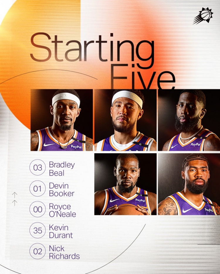 2025-02-24 16:14:40今日对阵猛龙!太阳首发:比尔、KD、布克、R-奥尼尔、理查兹