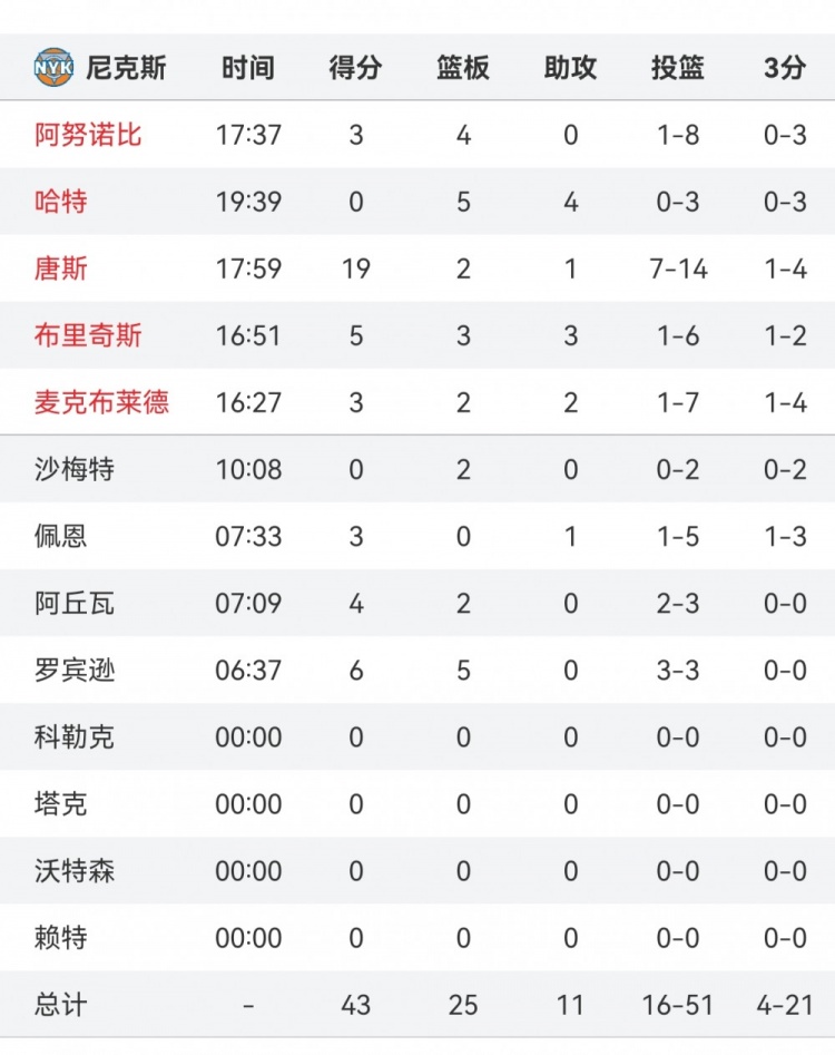 2025-03-20 21:58:39瞎打!唐斯半场19分 其余尼克斯首发24中3共得11分