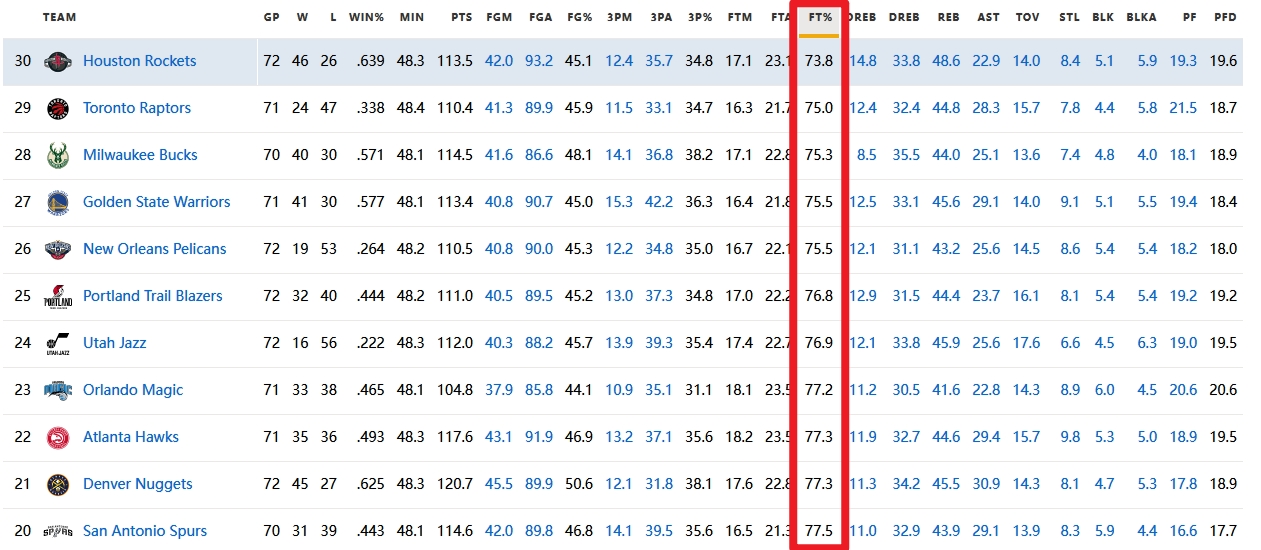 2025-03-24 14:40:27火箭本场34罚22中 赛季至今罚球命中率联盟倒数第一