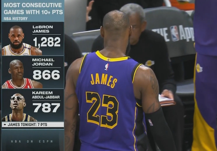 2025-03-27 20:45:06虽迟但到!詹姆斯第四节开局连得8分连续1283场比赛得分上双!