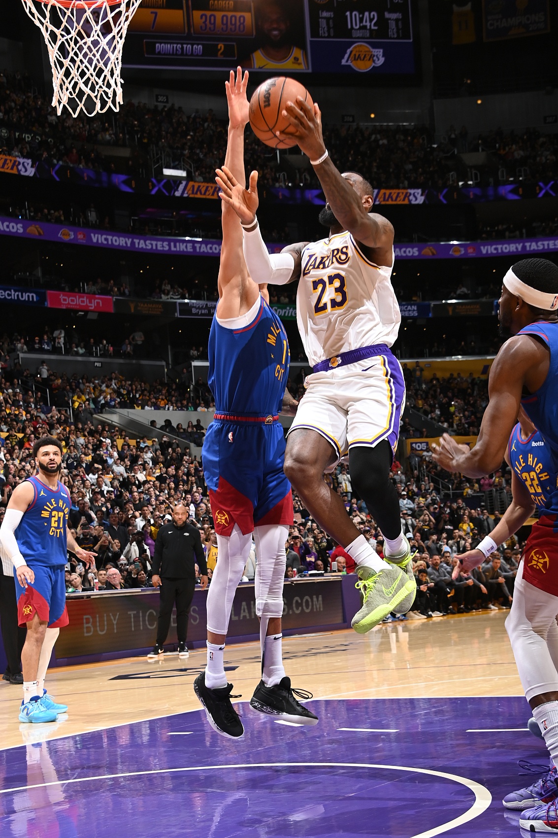 此役,湖人主场114-124不敌掘金,詹姆斯在第二节面对小迈克尔-波特上篮打进,完成了这历史性的一刻。