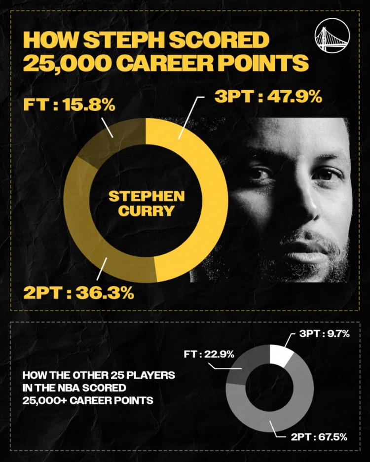 2025-03-10 10:54:48独树一帜!库里25000分中得分方式占比:三分47.9% 罚球仅15.8%