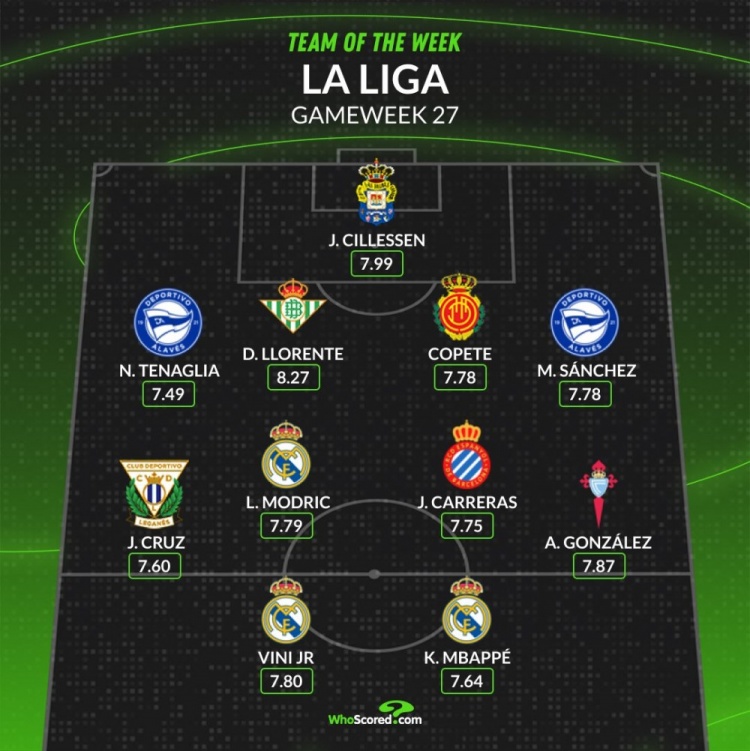 whoscored西甲第27轮最佳阵容: