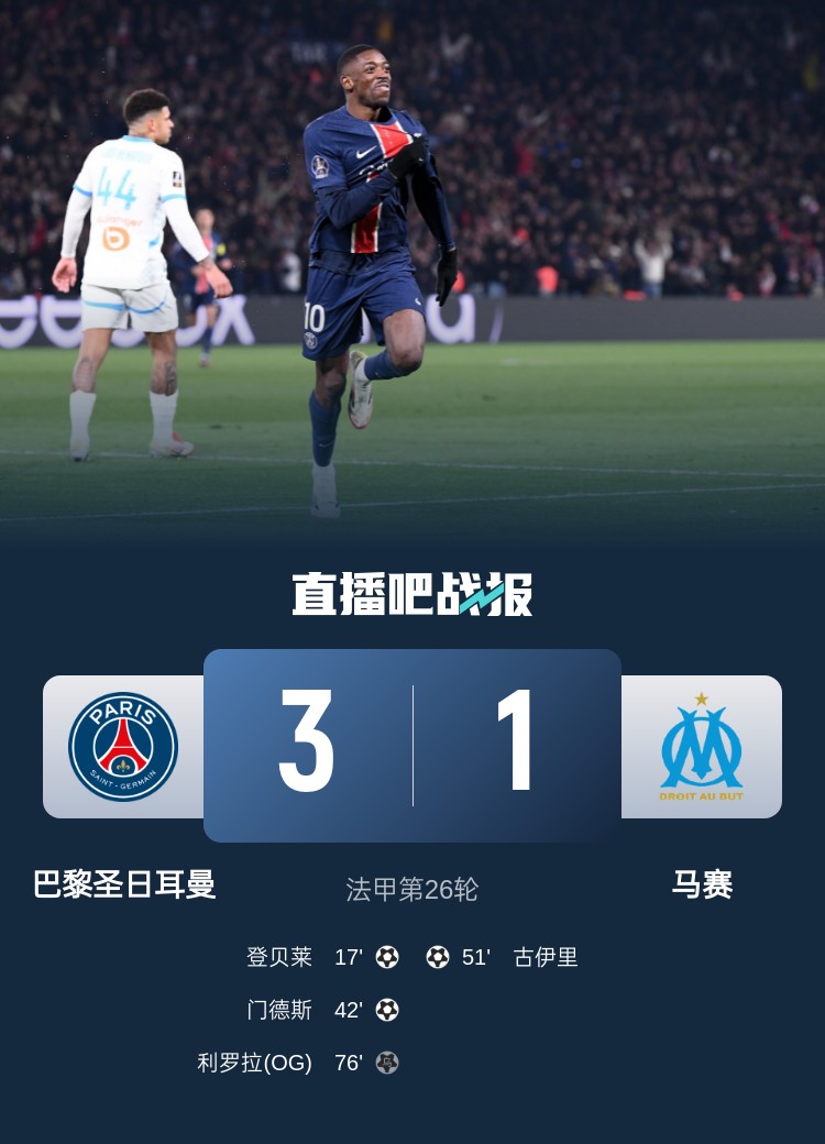笑傲德比!巴黎3-1马赛26轮不败19分领跑 登贝莱法甲赛季第21球