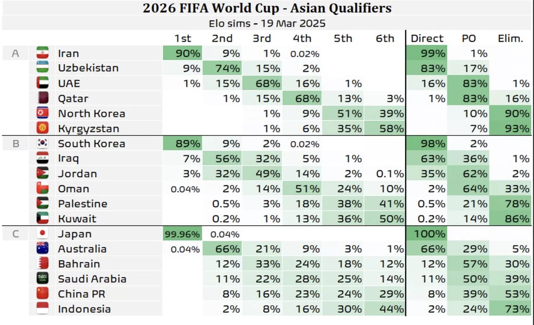 2025-03-20 10:13:0218强赛直通世界杯概率:日韩伊3队稳进 国足仅有8%