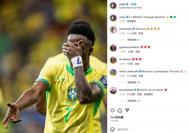 2025-03-22 10:11:04开场造点+世界波绝杀!维尼修斯社媒晒庆祝照:这就是巴西!