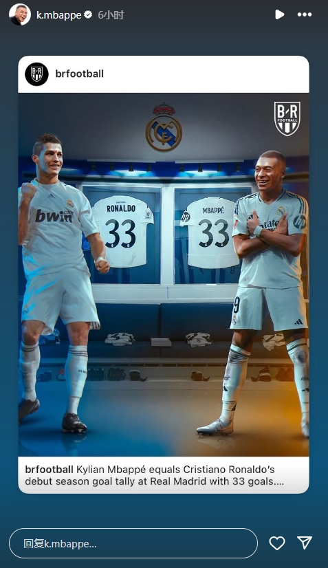 2025-03-30 20:14:10姆巴佩皇马首秀赛季33球追平C罗!赛后其社媒转发比肩偶像C罗的图