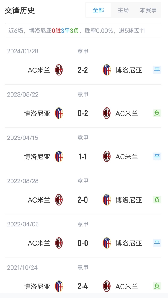 目前意甲25轮比赛过后,AC米兰11胜8平6负积41分,位列意甲第7位。博洛尼亚10胜11平4负积41分,位列第8。