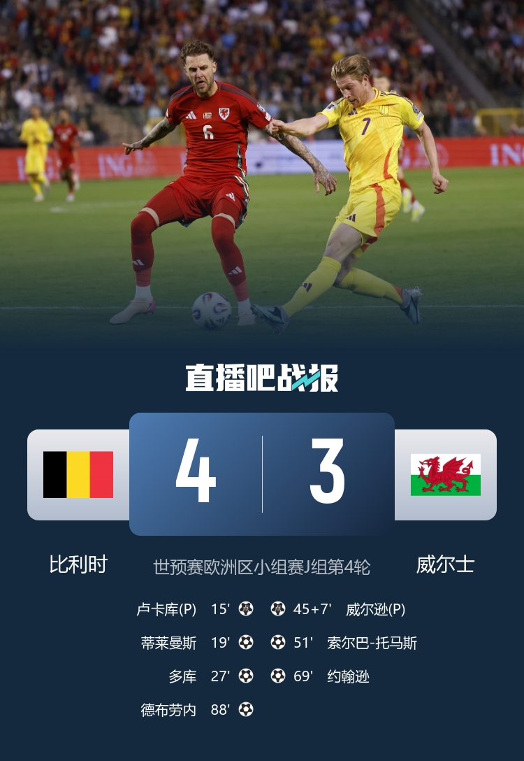 德布劳内88分钟绝杀,比利时有惊无险4-3击败威尔士,取得世预赛首胜。